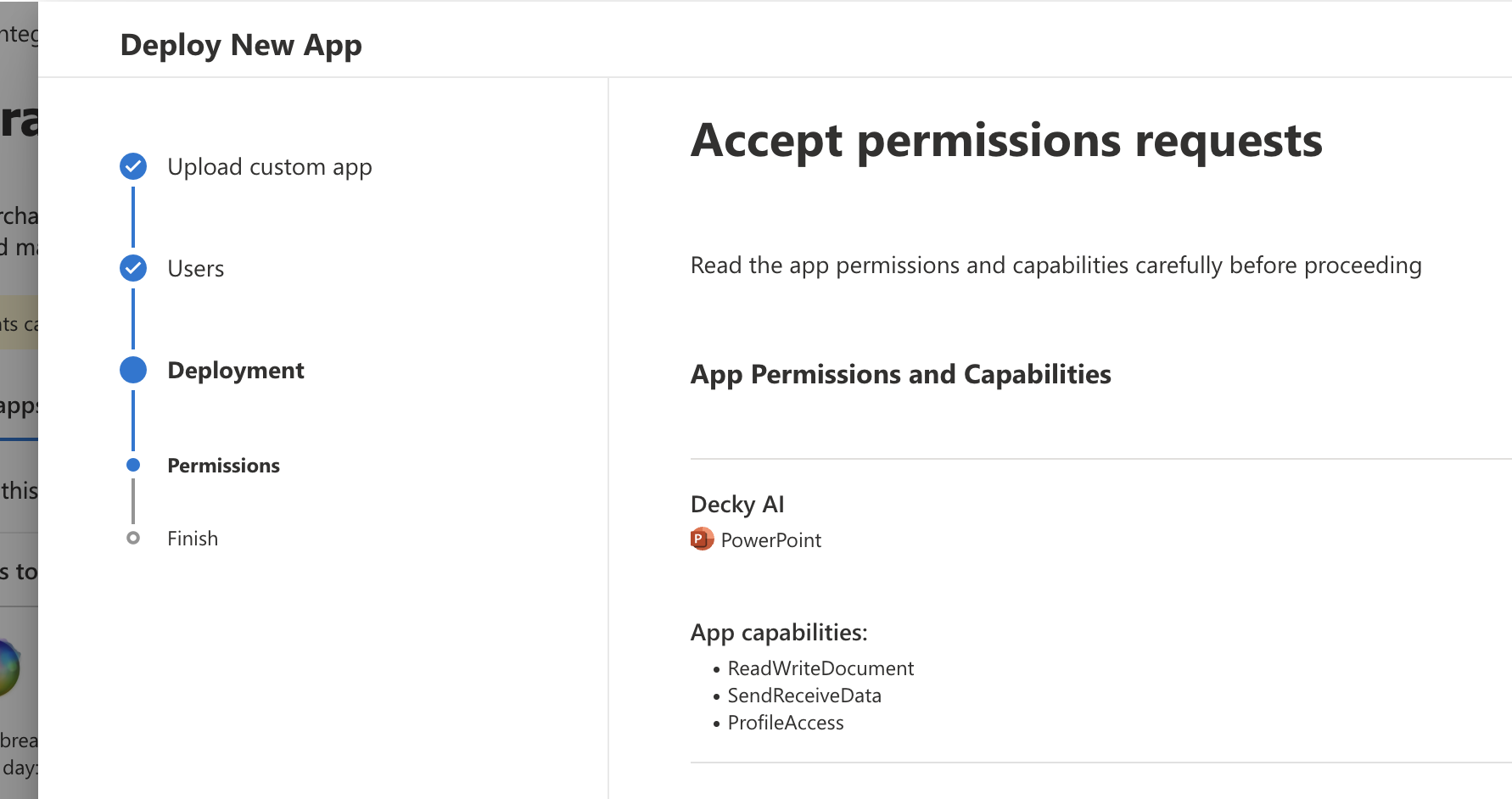 Afterwards accept the permissions request for decky and deploy the add-in.
