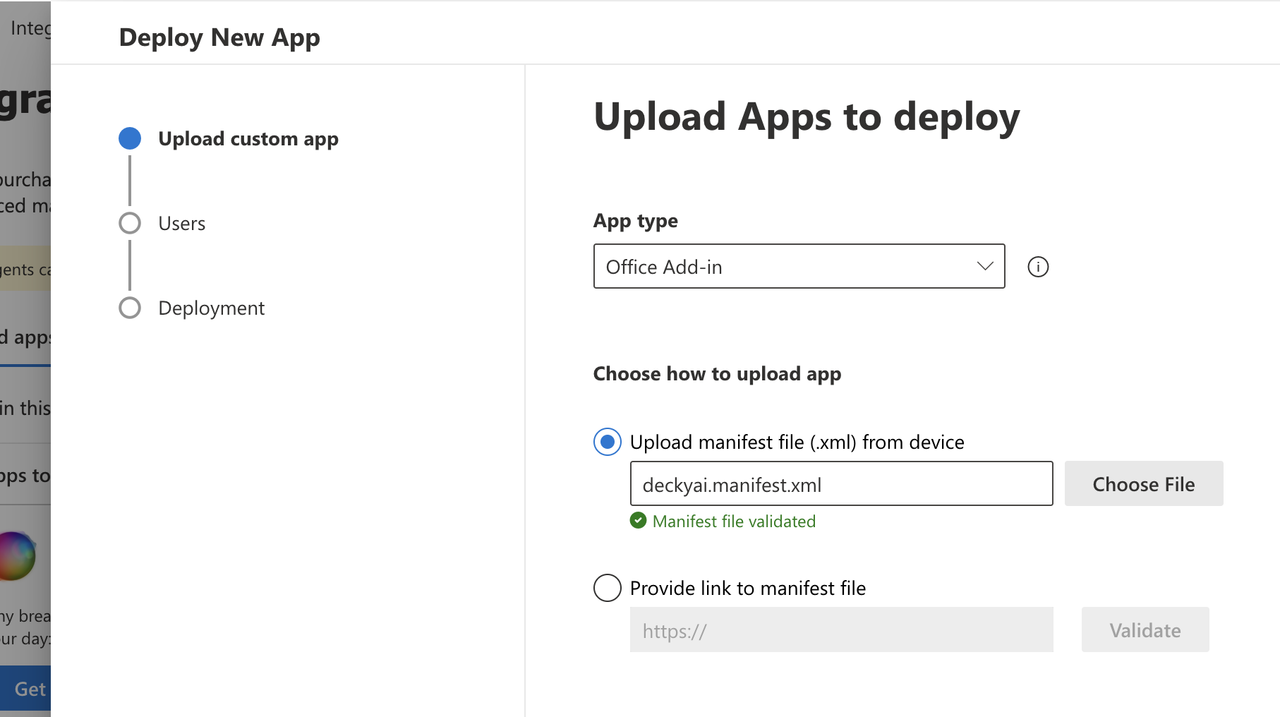 ⚠️ Admin rights required: You need administrator rights for managing add-ins. If you don't have the rights, ask your admin to upload the deckyai.manifest.xml which you downloaded above.